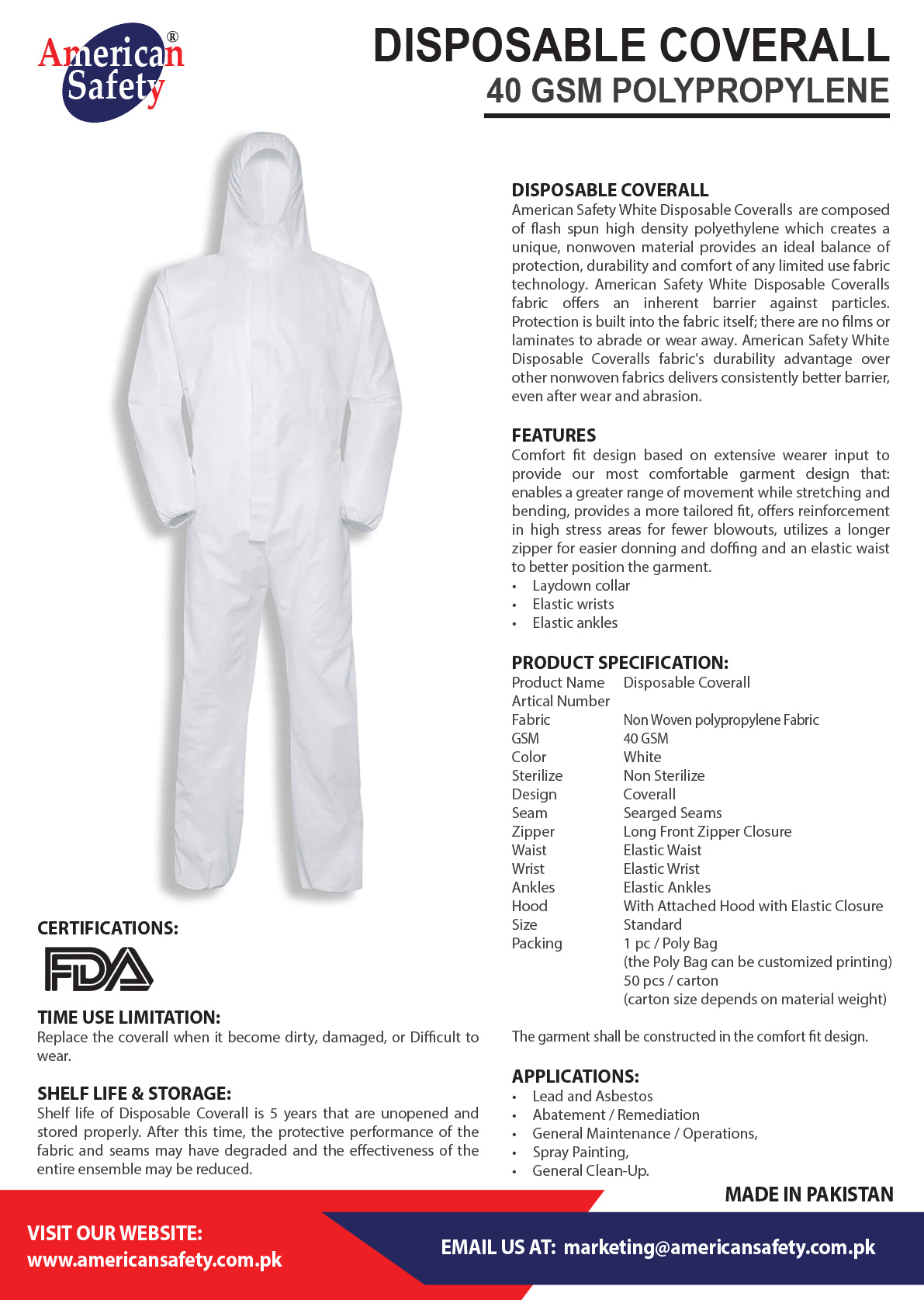 If you have any questions, just email us at info@americansafety.com.pk and we can help you find the perfect pair of coveralls. ASPT also offers embroidery services if you need your company logo on your workwear.